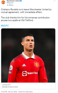 मैनचेस्टर यूनाइटेड ने कहा, ”क्रिस्टियानो रोनाल्डो तत्काल प्रभाव से आपसी समझौते से मैनचेस्टर यूनाइटेड छोड़ रहे हैं। क्लब ने उन्हें ओल्ड ट्रैफर्ड में दो स्पेल में उनके अपार योगदान के लिए धन्यवाद दिया। रोनाल्डो ने 346 मैचों में टीम के लिए 145 गोल किए। उन्हें और उनके परिवार को भविष्य के लिए शुभकामनाएं।